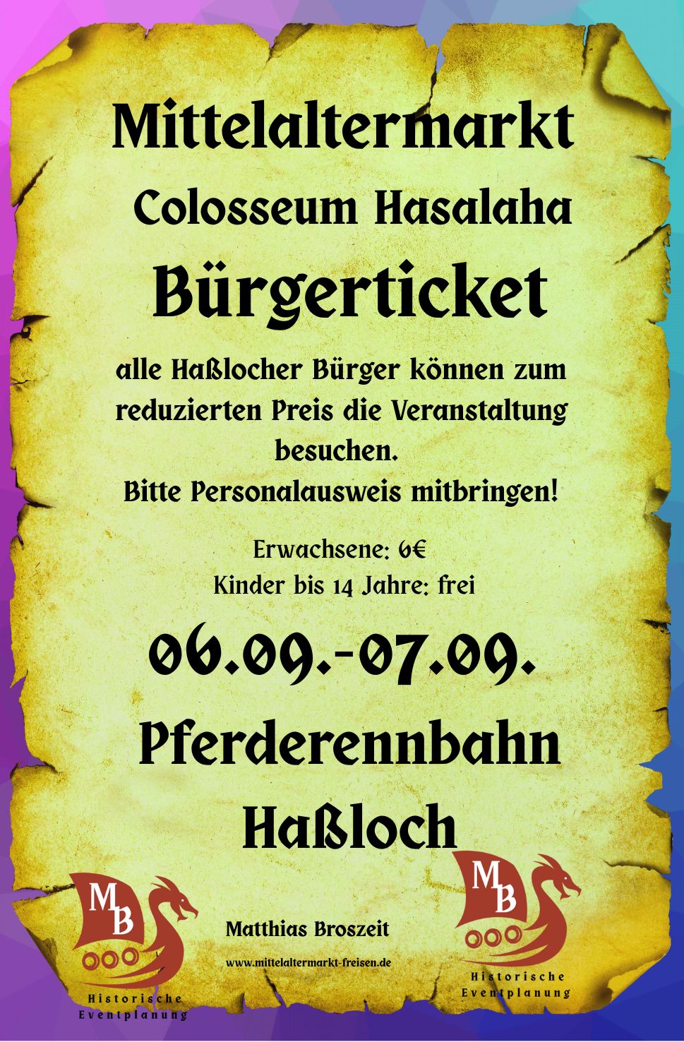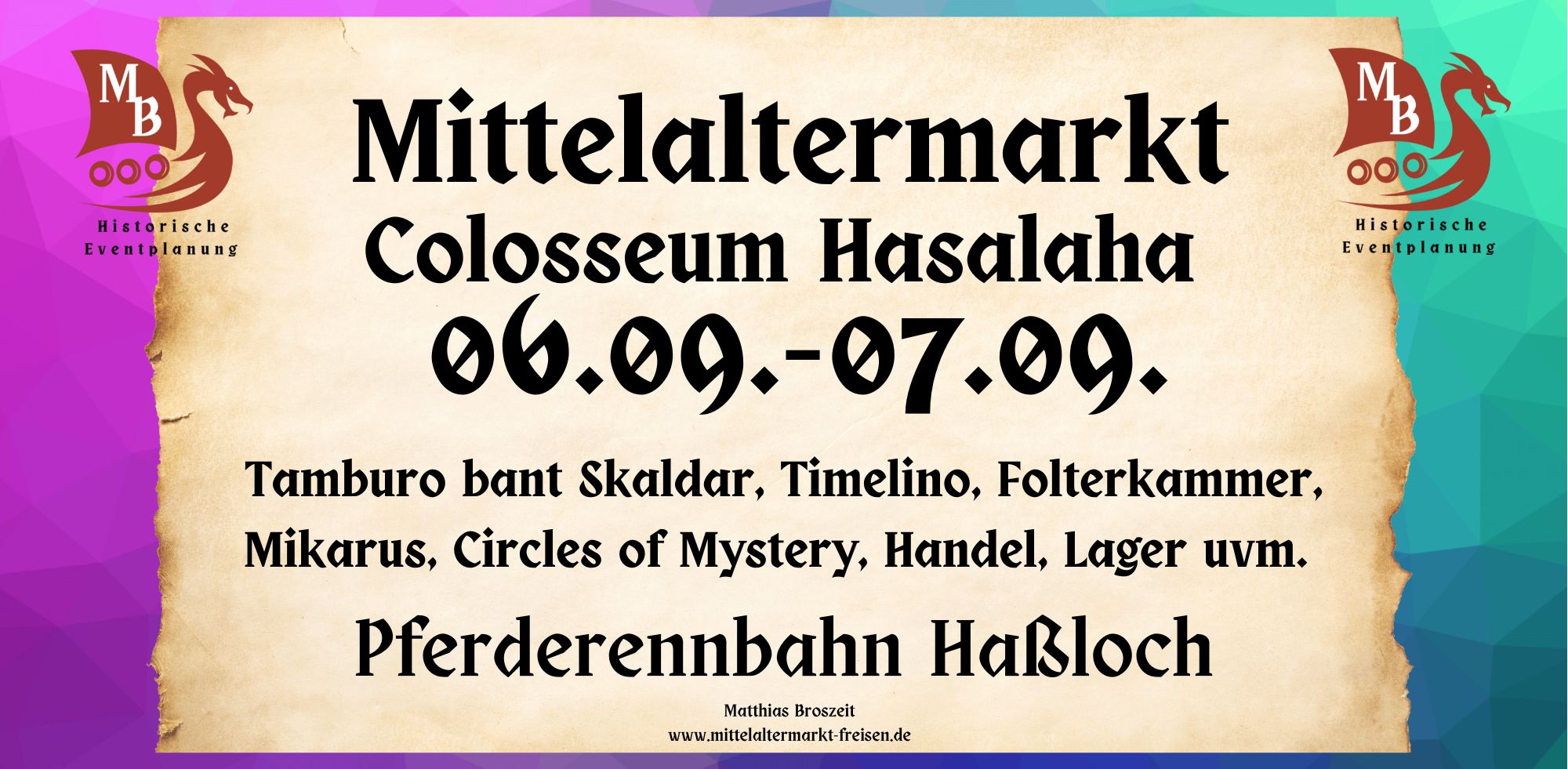 Nun möchten wir verkünden, dass im Jahre 2025 ein Mittelaltermarkt auf der Pferderennbahn zu Hassloch stattfinden wird.Kommt herbei von nah und fern und erlebt das Colosseum Hassalaha auf der Pferderennbahn zu Hassloch.